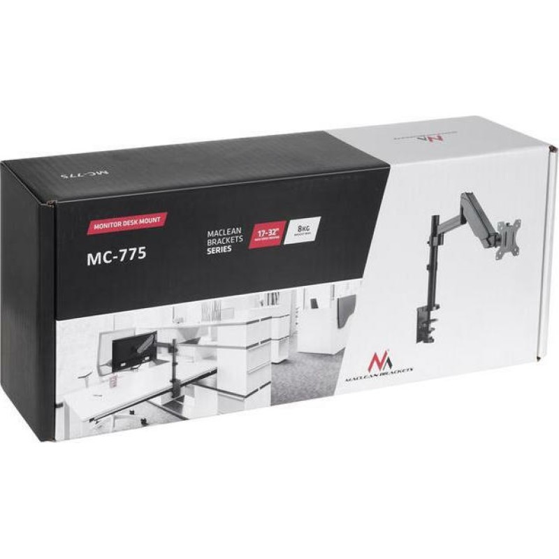 Η βάση της Maclean Energy τοποθετείται στην άκρη του γραφείου με ρυθμιζόμενο σφιγκτήρα και μπορεί να χρησιμοποιηθεί για τη στήριξη οθονών ως και 32 ιντσών με μέγιστο βάρος 8 κιλά. Για το βίδωμα της οθόνης υπάρχουν 2 υποδοχές διαφορετικών τύπων vesa 100 x 100 και 75 x 75 mm.