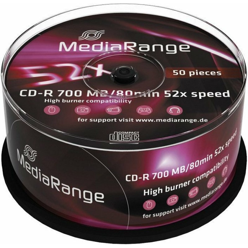 Εγγράψιμα CD σε συσκευασία 50 τεμαχίων της εταιρείας MediaRange για την αποθήκευση δεδομένων, φωτογραφιών ή της μουσικής σας. Τα CD-R δεν σβήνονται καθώς η εγγραφή τους επιτρέπεται μία φορά μόνο.