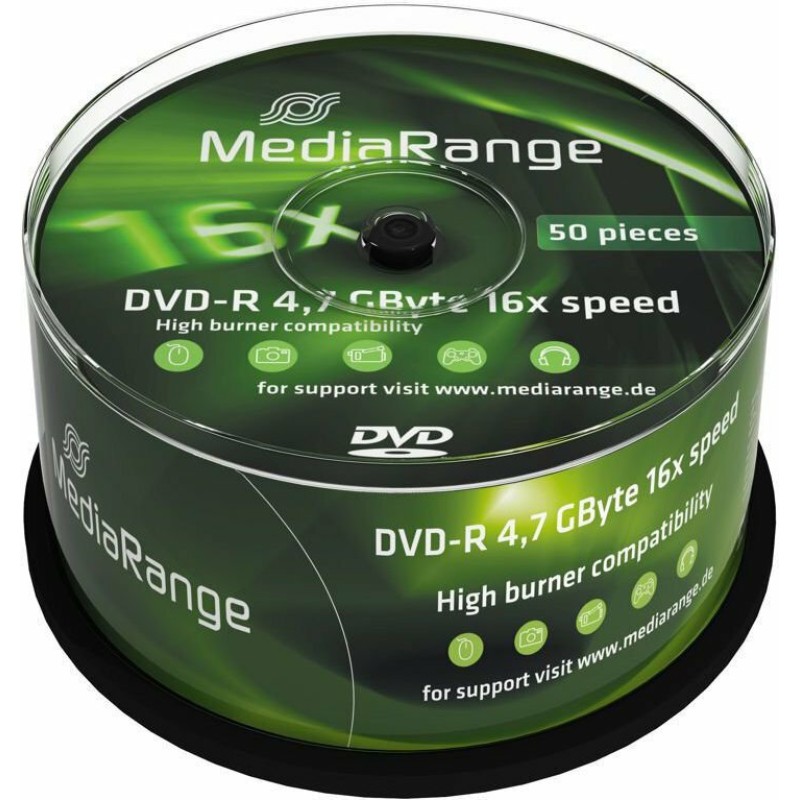 Εγγράψιμα DVD σε συσκευασία 50 τεμαχίων της εταιρείας MediaRange για την αποθήκευση δεδομένων, φωτογραφιών, ταινιών ή μουσικής. Τα DVD-R δεν σβήνονται καθώς η εγγραφή τους επιτρέπεται μία φορά μόνο. Δεν έχει ιδιαίτερες διαφορές από το DVD+R.
