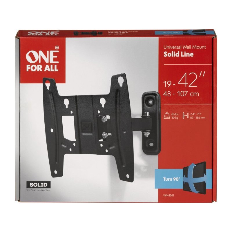 Τα προϊόντα που δεν αναγράφουν διαθέσιμο σημαίνει ότι δεν υπάρχουν άμεσα διαθέσιμα στο κατάστημα και θα παραληφθούν το αργότερο εντός των εργάσιμων ημερών που αναγράφεται στη διαθεσιμότητα. Σε κάθε περίπτωση η ημερομηνία μπορεί να μεταβληθεί και θα υπάρχει σχετική ενημέρωσή σας.Η βάση τοίχου της One For All μπορεί να χρησιμοποιηθεί για την τοποθέτηση τόσο μικρών τηλεοράσεων (από 19 Ίντσες), όσο και μεγαλύτερων, συγκεκριμένα μέχρι και 42 Ιντσών. Για το βίδωμα της τηλεόρασης υπάρχουν υποδοχές τύπου Vesa 200x200. Με τις δυνατότητες για κλίση και περιστροφή, μπορείτε να την προσαρμόζετε πάνω - κάτω και αριστερά - δεξιά όπως θέλετε.