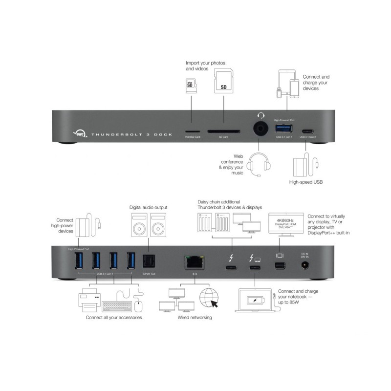 Το OWC Thunderbolt 3 Dock είναι εξοπλισμένο με μεγάλο αριθμό θυρών και μπορεί να συνδεθεί μέσω USB-C σε σχεδόν κάθε συσκευή με Mac OS (10.12 ή νεότερο) και Windows 10 (ή νεότερο). Προσφέρει συνολικά 14 συνδέσεις κάποιες από τις οποίες είναι: 5 θύρες USB-A 3.2, 1 οπτική ίνα, SD και MicroSD card reader. 2 θύρες Thunderbolt 3 είναι διαθέσιμες για γρήγορη μεταφορά δεδομένων και άλλη μία με δυνατότητα μεταφοράς ρεύματος 85W για φόρτιση των συνδεδεμένων συσκευών. Μία θύρα RJ-45 σας επιτρέπει να έχετε σταθερή σύνδεση στο δίκτυο, ενώ προσφέρει επιπλέον μια θύρα εξόδου οπτικής ίνας και μία Mini DisplayPort που μπορούν να χρησιμοποιηθούν για mirror οθονών με μέγιστη ανάλυση 5120 x 2880 pixels (5K).