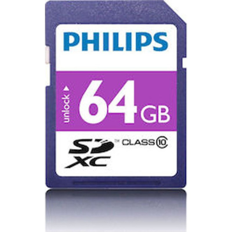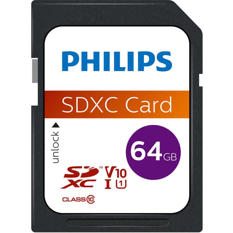 SDXC κάρτα μνήμης της εταιρίας Philips. Διαθέτει χωρητικότητα 64GB. Το μέγεθος αυτό είναι ικανό να υποστηρίξει την αποθήκευση μεγάλου όγκου φωτογραφιών υπερυψηλής ανάλυσης, μικρό αριθμό παιχνιδιών (αν προορίζεται για κονσόλα), πολύωρη καταγραφή σε action cams, drones κ.α.