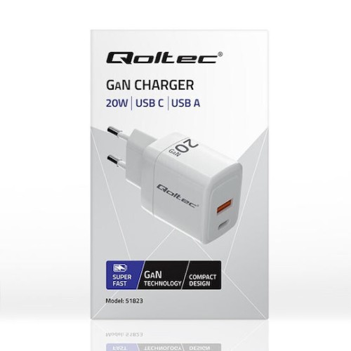 Qoltec Φορτιστής Χωρίς Καλώδιο GaN με Θύρα USB-A και Θύρα USB-C 20W Power Delivery Λευκός (51823) (51823)