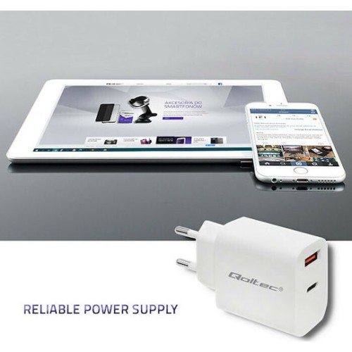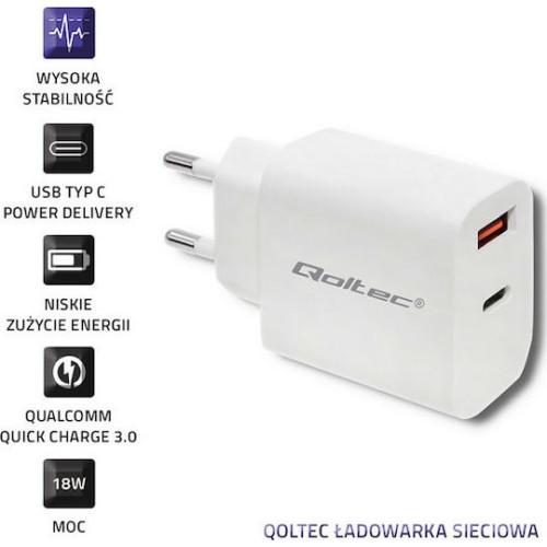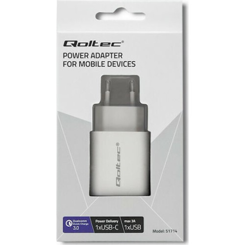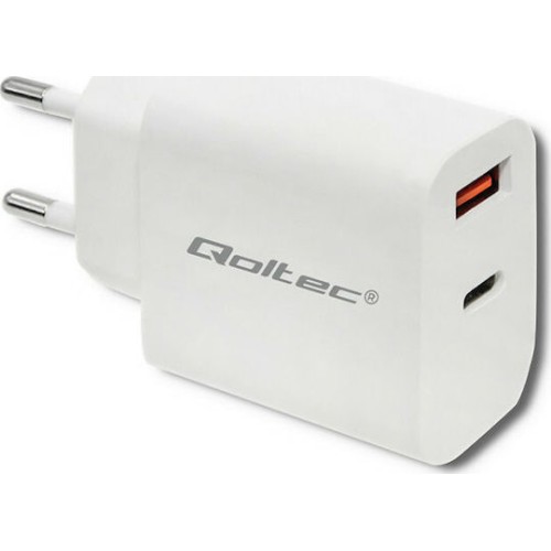 Qoltec Φορτιστής Χωρίς Καλώδιο με Θύρα USB-A και Θύρα USB-C 18W Power Delivery / Quick Charge 3.0 Λευκός (51714) (TUO-51714)