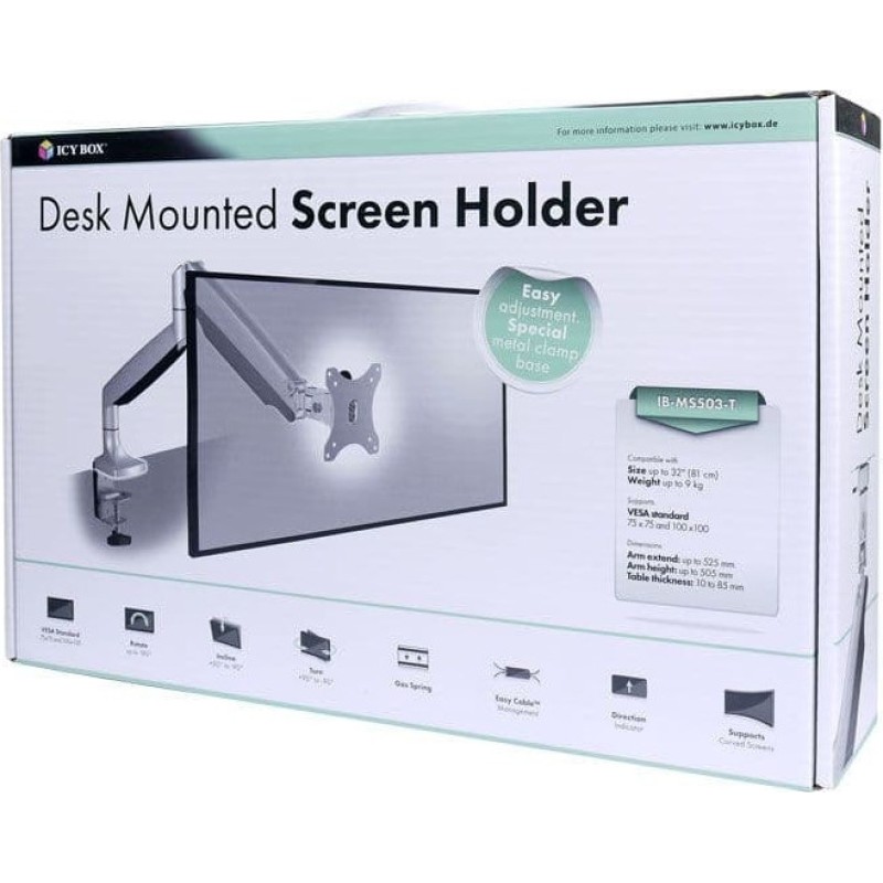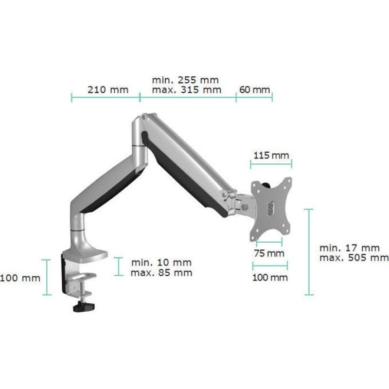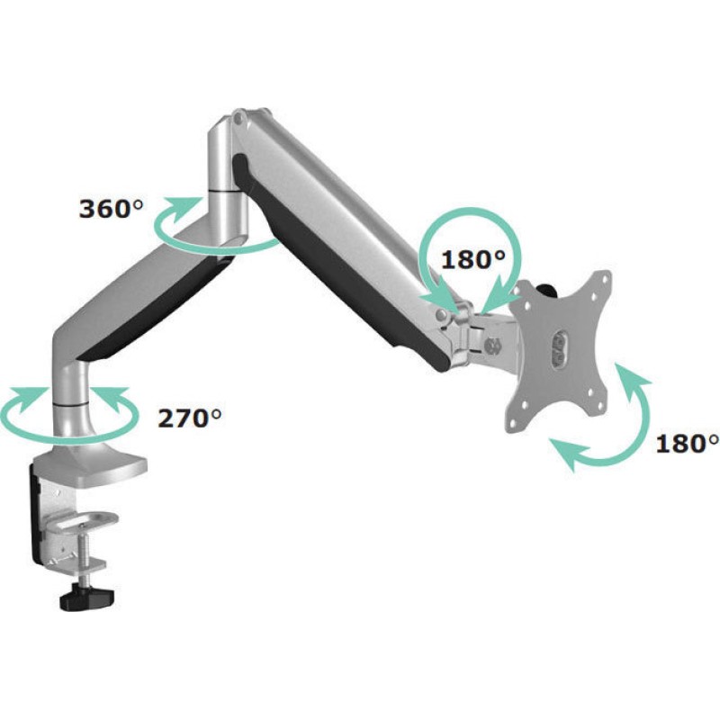 Επιτραπέζια μεταλλική βάση στήριξης για οθόνη έως 32" και μέγιστου βάρους 9 kg, με 2 βραχίονες και πλήρη ελευθερία κινήσεων. Διαθέτει 4 συνολικά αρθρώσεις με ελευθερία κίνησης, οι οποίες σας επιτρέπουν να έχετε ανά πάσα στιγμή την οθόνη σας στην επιθυμητή θέση.Χάρη στο clamp στήριξης που διαθέτει μπορείτε εύκολα να την τοποθετήσετε με ασφάλεια στο γραφείο σας (μέγιστο πάχος επιφάνειας γραφείου έως και 85mm).