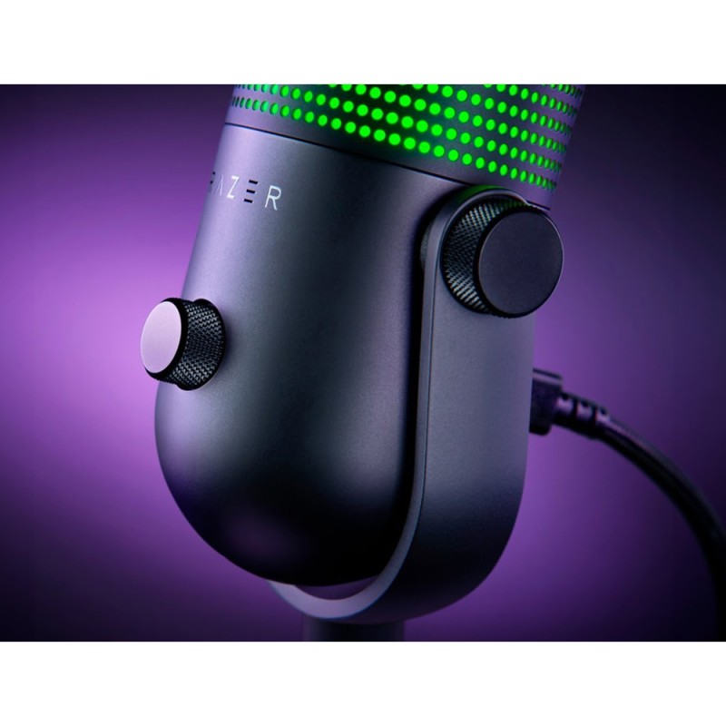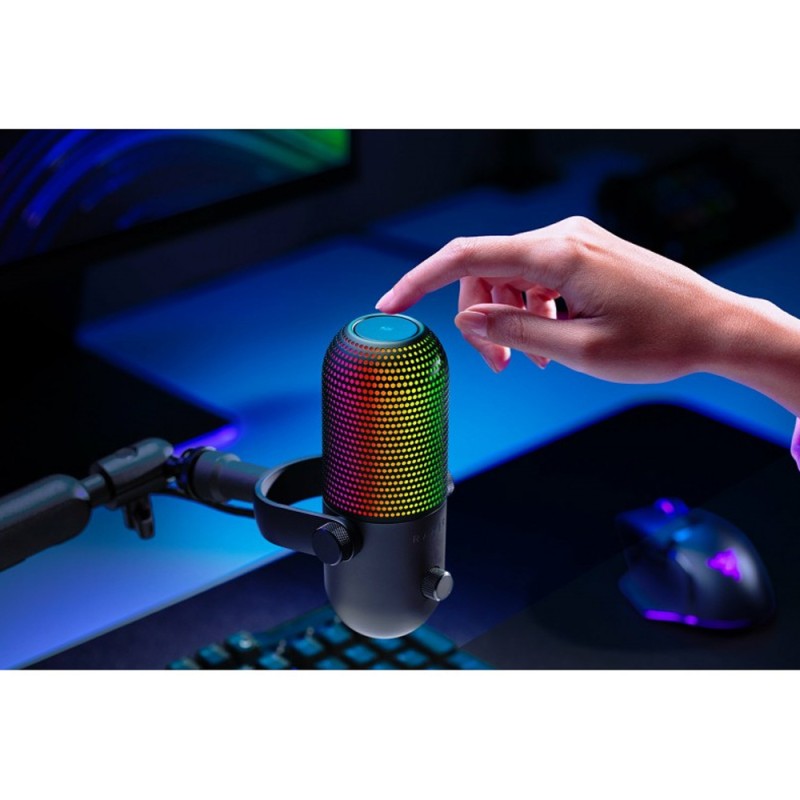 Το πυκνωτικό μικρόφωνο Seiren V3 Chroma της Razer διαθέτει αντιδραστικό φωτισμό με Games και Streaming που υποστηρίζεται από το Razer Chroma RGB για να ενισχύστε το θέαμα και την εμβύθισή σας με φωτισμό που όχι μόνο λειτουργεί με παιχνίδια που είναι ενσωματωμένα στο Chroma, αλλά ανταποκρίνεται σε συμβάντα του Stream σας, όπως emotes, ειδοποιήσεις και άλλα. Έχει αισθητήρα πολλαπλών λειτουργιών Tap-to-Mute για άμεσο και διαισθητικό έλεγχο, απλά πατήστε το πάνω μέρος του μικροφώνου για να αποτρέψετε τις κακοτοπιές κατά τη διάρκεια του παιχνιδιού, της συνομιλίας ή του Stream σας. Χαρτογραφήστε τις εντολές διπλού και τριπλού πατήματος για να ρυθμίσετε τον φωτισμό και να ενεργοποιήσετε τον Digital Gain Limiter του μικροφώνου. Με το υπερκαρδιοειδές πυκνωτικό μικρόφωνο σας προσφέρει καθαρότητα και ποιότητα. Ακούστε τον καλύτερό σας ήχο με μια εντυπωσιακή ευαισθησία μικροφώνου που μπορεί να συλλάβει περισσότερες λεπτομέρειες στη φωνή σας, υποστηριζόμενη από ένα στενότερο μοτίβο λήψης που καταστέλλει τους θορύβους του χώρου, όπως η πληκτρολόγηση ή τα κλικ του ποντικιού. Με τον αυτόματο Gain Limiter, την ενσωματωμένη σχεδίαση απόσβεσης θορύβου και τον δυναμικό φωτισμό που προειδοποιεί όταν τα επίπεδα ήχου σας κορυφώνονται, δεν θα χρειάζεται ποτέ να ανησυχείτε ότι ακούγεστε πολύ δυνατά ή παραμορφωμένοι. Ακόμα, ο απλός σχεδιασμός Plug-and-Play για εγκατάσταση χωρίς προβλήματα σας δίνει την δυνατότητα για παιχνίδι, ροή ή συνομιλία σε δευτερόλεπτα. Απλώς συνδέστε το μικρόφωνο USB στον υπολογιστή σας και είστε έτοιμοι να ξεκινήσετε - δεν απαιτείται λογισμικό ή Driver. Λειτουργεί με Discord, OBS Studio, XSplit και άλλα.Τέλος, με την προηγμένη προσαρμογή μέσω του Razer Synapse μπορείτε εύκολα να εξατομικεύσετε το φωτισμό του μικροφώνου, να ορίσετε ρυθμούς δειγματοληψίας και bit σε επίπεδο στούντιο, να διαχειριστείτε το μείγμα ροής για να ορίσετε ξεχωριστές μίξεις έντασης για την αναπαραγωγή και τη ροή σας και πολλά άλλα.