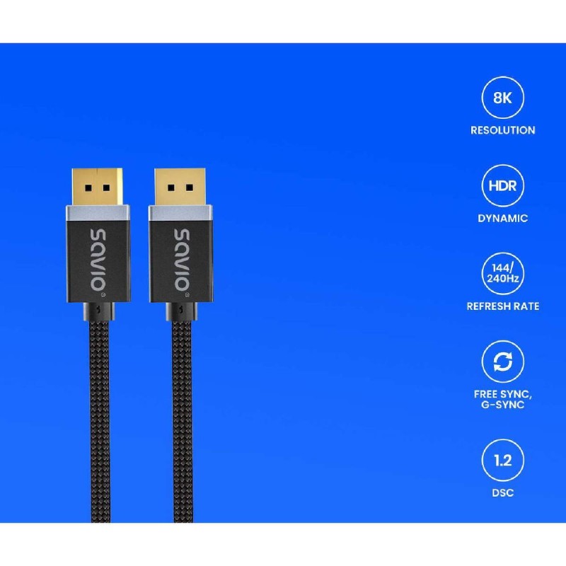 Το καλώδιο της εταιρείας Savio έχει μήκος 2m και διαθέτει δύο ακροδέκτες DisplayPort male για τη σύνδεση οθόνης στην κάρτα γραφικών του υπολογιστή με αυτή τη θύρα. Οι ακροδέκτες είναι επίχρυσοι για ταχύτατη αναμετάδοση δεδομένων χωρίς παρεμβολές κι αντοχή στο χρόνο, καθώς ο χρυσός δεν διαβρώνεται εύκολα.