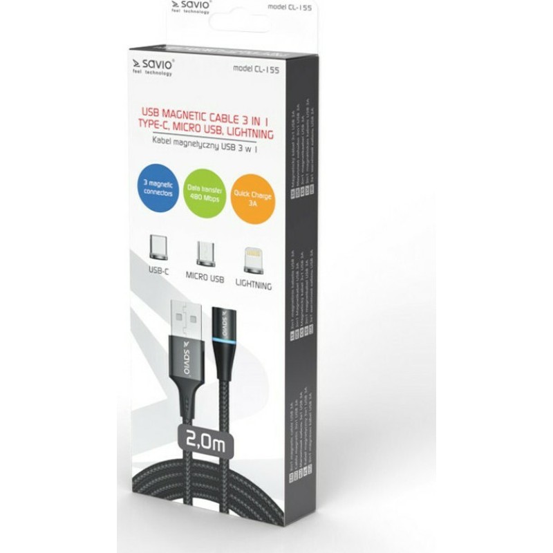 Savio Magnetic USB to Lightning / Type-C / micro USB Cable Μαύρο 2m (CL-155) (CL-155)