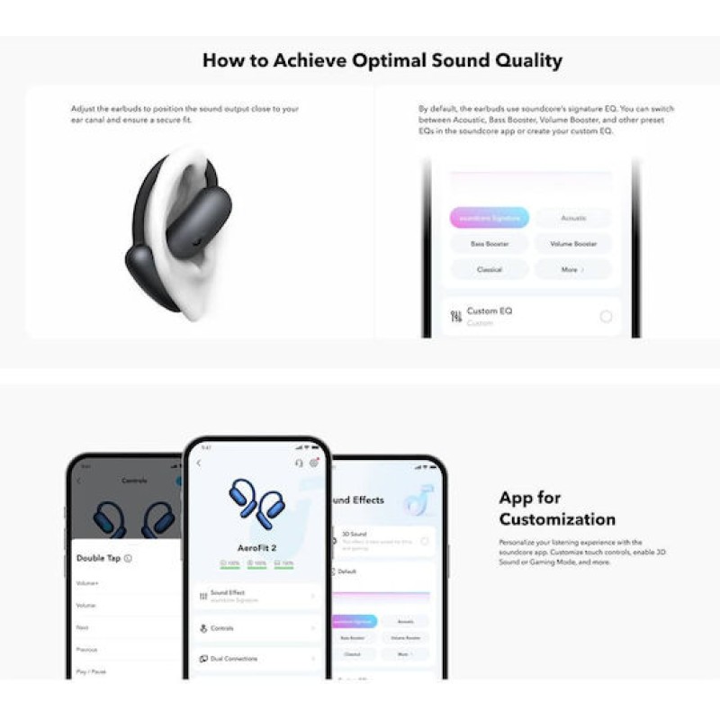 Τα προϊόντα που δεν αναγράφουν διαθέσιμο σημαίνει ότι δεν υπάρχουν άμεσα διαθέσιμα στο κατάστημα και θα παραληφθούν το αργότερο εντός των εργάσιμων ημερών που αναγράφεται στη διαθεσιμότητα. Σε κάθε περίπτωση η ημερομηνία μπορεί να μεταβληθεί και θα υπάρχει σχετική ενημέρωσή σας.Τα Soundcore AeroFit 2 είναι open-ear ασύρματα ακουστικά που σχεδιάστηκαν για άνεση όλη μέρα, χωρίς να “μπαίνουν” μέσα στο αυτί. Χρησιμοποιούν εργονομικά ear hooks με 4 επίπεδα ρύθμισης ώστε να εφαρμόζουν σταθερά σε διαφορετικά σχήματα αυτιών, κάτι που τα κάνει ιδανικά για άθληση και πολύωρη χρήση.Διαθέτουν μεγάλα drivers 20×11.5mm και υποστηρίζουν Hi-Res ασύρματο ήχο με πλούσια μπάσα, ενώ κρατούν τον σχεδιασμό τους “ανοιχτό”, ώστε να ακούς και το περιβάλλον γύρω σου για μεγαλύτερη ασφάλεια στην κίνηση ή στο δρόμο.Η μπαταρία φτάνει περίπου τις 10 ώρες συνεχούς χρήσης και έως 42 ώρες με τη θήκη, ενώ υποστηρίζουν γρήγορη φόρτιση (περίπου 4 ώρες χρήσης σε 10 λεπτά).Συνολικά, τα AeroFit 2 είναι μια πολύ καλή επιλογή για όσους θέλουν άνεση, ασφάλεια και καλό ήχο χωρίς απομόνωση από το περιβάλλον, ειδικά για γυμναστική, δουλειά ή καθημερινές μετακινήσεις.