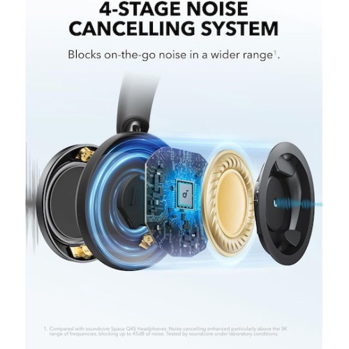 Τα Soundcore Space One Pro είναι over‑ear ακουστικά με ισχυρή ακύρωση θορύβου (ANC) 4 σταδίων και custom algorithm που προσαρμόζεται στο περιβάλλον. Διαθέτουν οδηγούς με τριπλό σύνθετο διαφράγμα για καθαρό ήχο υψηλής ανάλυσης, και προσφέρουν αυτονομία μέχρι ~40 ώρες με ενεργή ακύρωση ήχου και ~60 ώρες χωρίς αυτήν.