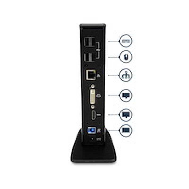 Docking Station της εταιρίας StarTech που συνδέεται σε Laptop με θύρα USB-A. Εξοπλίζεται με συνδέσεις για τις περιφερειακές συσκευές όπως 2 θύρες USB-A 3.0, 4 θύρες USB-A 2.0 και συνδέεται με οθόνη καθώς διαθέτει 1 θύρα DVI, 1 θύρα HDMI 1.4. Ενσωματώνει θύρα Ethernet για την σύνδεση στο διαδίκτυο και audio Jack 3.5" για σύνδεση ακουστικών, ηχείων κ.α.