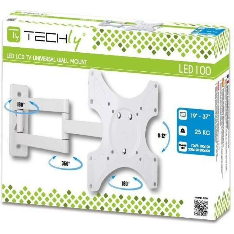 Η βάση τοίχου με βραχίονα της Techly μπορεί να χρησιμοποιηθεί για την τοποθέτηση τόσο μικρών τηλεοράσεων (από 19 Ίντσες), όσο και μεγαλύτερων, συγκεκριμένα μέχρι και 37 Ιντσών. Για το βίδωμα της τηλεόρασης υπάρχουν υποδοχές 4 διαφορετικών τύπων Vesa, μεταξύ των οποίων βρίσκονται και οι δημοφιλείς 200x200 και 100x100 (δείτε όλους τους συμβατούς τύπους στα Χαρακτηριστικά Συμβατότητας). Η δυνατότητα για κλίση σας επιτρέπει να την προσαρμόζετε πάνω - κάτω όπως θέλετε.