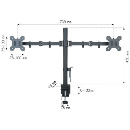 Η διπλή βάση γραφείου για οθόνες 13–27'' προσφέρει εργονομία και εξοικονόμηση χώρου, υποστηρίζοντας δύο οθόνες πλευρικά. Διαθέτει συμβατότητα με VESA 75x75 και 100x100 mm, μέγιστο βάρος 10 kg ανά οθόνη και ρυθμιζόμενο σωλήνα ύψους 450 mm. Εγκαθίσταται εύκολα με σφιγκτήρα τύπου "C" ή βίδα, περιλαμβάνει διαχείριση καλωδίων και προσφέρει πλήρη ρύθμιση κλίσης, περιστροφής και ύψους για άνετη θέαση. Περιλαμβάνονται όλα τα απαραίτητα εξαρτήματα και οδηγίες εγκατάστασης.