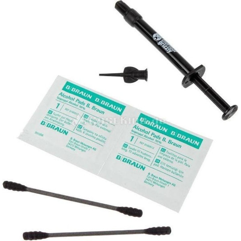 1x Syringe with liquid metal / 1x Metal needle for application / 1x Plastic needle for absorbing / 2x Lint-free industrial cotton swabs / 2x Cleaning pad