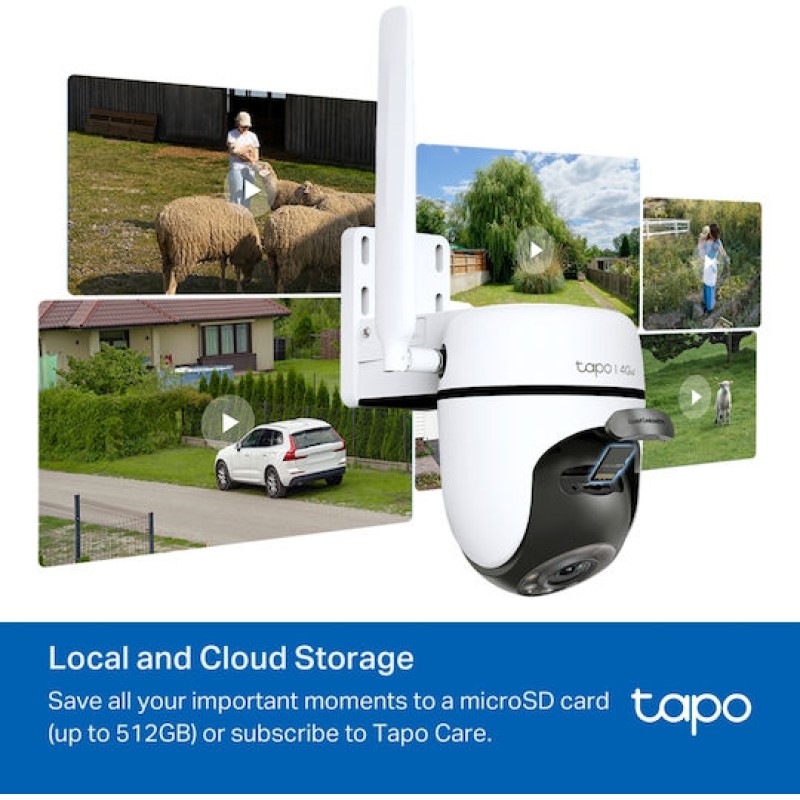 Εξωτερική κάμερα 4G LTE με δυνατότητα Pan/Tilt Χωρίς Wi-Fi, χωρίς όριο: Συνδέεται μέσω δικτύων 4G LTE, ιδανικό για μέρη όπου δεν υπάρχει σύνδεση Wi-Fi. Προστασία 360°: Παρέχει 360° οριζόντια & 130° κάθετη εμβέλεια προβολής, εξαλείφοντας τα τυφλά σημεία. AI Detection: Η έξυπνη τεχνητή νοημοσύνη αναγνωρίζει ανθρώπους, κατοικίδια και οχήματα, στέλνοντας άμεσα ειδοποιήσεις μέσω της εφαρμογής Tapo. 1080P Full HD: Αποκαλύπτει ευκρινείς εικόνες και ζωντανές λεπτομέρειες με 1920 × 1080 pixels. Έγχρωμη νυχτερινή όραση Starlight: Καταγράφει ζωντανές εικόνες σε συνθήκες χαμηλού φωτισμού σε απόσταση έως και 20 μέτρων. Πιστοποίηση IP66: Ανθεκτική στη βροχή, τη σκόνη και τη ζέστη για εξωτερικά σενάρια. Ηχητικός και φωτεινός συναγερμός: Δημιουργήστε το δικό σας ηχητικό συναγερμό για να αποτρέψετε ανεπιθύμητους εισβολείς και προσαρμόστε την ένταση των διπλών προβολέων. Τοπική αποθήκευση και αποθήκευση cloud: Αποθηκεύστε όλες τις σημαντικές στιγμές σας σε μια κάρτα microSD (έως 512GB) ή εγγραφείτε στο Tapo Care για υπηρεσία cloud. Ευελιξία διπλής λειτουργίας με 4G ή PoE: Τροφοδοτήστε την κάμερά σας με προσαρμογέα DC ή καλώδιο Ethernet που διαθέτει τεχνολογία PoE.