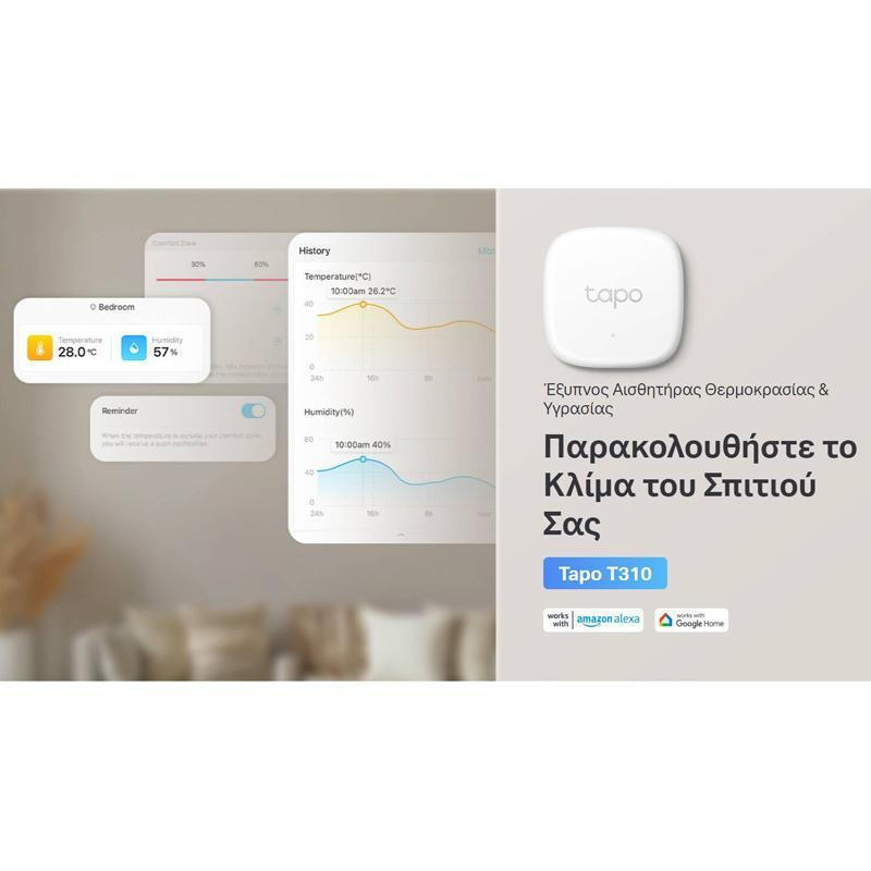 Ο αισθητήρας Tapo T310 της TP-LINK απευθύνεται σε χρήστες που θέλουν να παρακολουθούν το περιβάλλον τους μέσω αισθητήρων και να λαμβάνουν ειδοποιήσεις στο κινητό τους τηλέφωνο ή στο tablet τους σχετικά με τη θερμοκρασία, την υγρασία, το φως και τον ήχο. Συνδέεται με την εφαρμογή Tapo της TP-LINK, η οποία επιτρέπει στους χρήστες να δουν τις μετρήσεις των αισθητήρων σε πραγματικό χρόνο και να λάβουν ειδοποιήσεις στο κινητό τους τηλέφωνο ή στο tablet τους όταν υπάρχει αλλαγή στις συνθήκες που παρακολουθούνται.
