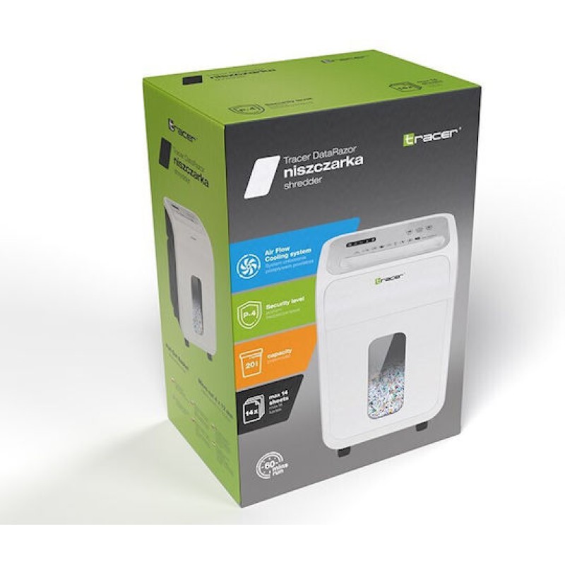 Ο Tracer DataRazor είναι ένας επαγγελματικός καταστροφέας εγγράφων, κατάλληλος για απαιτητική χρήση σε γραφείο. Διαθέτει σύστημα κοπής cross-cut με μέγεθος τεμαχίων 4 × 12 mm, προσφέροντας υψηλό επίπεδο ασφάλειας (P-4). Μπορεί να καταστρέψει έως και 14 φύλλα χαρτιού ταυτόχρονα, καθώς και πιστωτικές κάρτες, CD/DVD, συνδετήρες και συρραπτικά. Λειτουργεί αθόρυβα (περίπου 60 dB), έχει κάδο 20 λίτρων και υποστηρίζει συνεχόμενη λειτουργία έως 60 λεπτά χάρη στο σύστημα ψύξης Air Flow Cooling. Είναι εξοπλισμένος με λειτουργίες αυτόματης εκκίνησης/παύσης, αντίστροφης κίνησης και προστασίας από υπερθέρμανση, εξασφαλίζοντας ασφάλεια και άνεση στη χρήση.