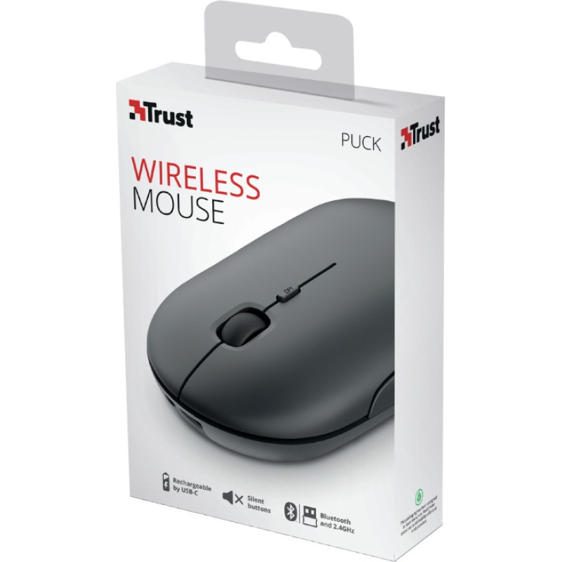 Τα προϊόντα που δεν αναγράφουν διαθέσιμο σημαίνει ότι δεν υπάρχουν άμεσα διαθέσιμα στο κατάστημα και θα παραληφθούν το αργότερο εντός των εργάσιμων ημερών που αναγράφεται στη διαθεσιμότητα. Σε κάθε περίπτωση η ημερομηνία μπορεί να μεταβληθεί και θα υπάρχει σχετική ενημέρωσή σας.Το Trust Puck Rechargeable είναι ένα ασύρματο ποντίκι, το οποίο συνδέεται στον υπολογιστή απευθείας με Bluetooth ή με dongle (πομποδέκτη) που τοποθετείται στη θύρα USB. Έχει οπτικό αισθητήρα που προσφέρει καλή ακρίβεια και το καθιστά ιδανικό για καθημερινή χρήση. Εφόσον χρησιμοποιηθεί σε γυαλιστερές επιφάνειες (πχ. γυάλινο γραφείο), είναι απαραίτητη η χρήση mousepad.