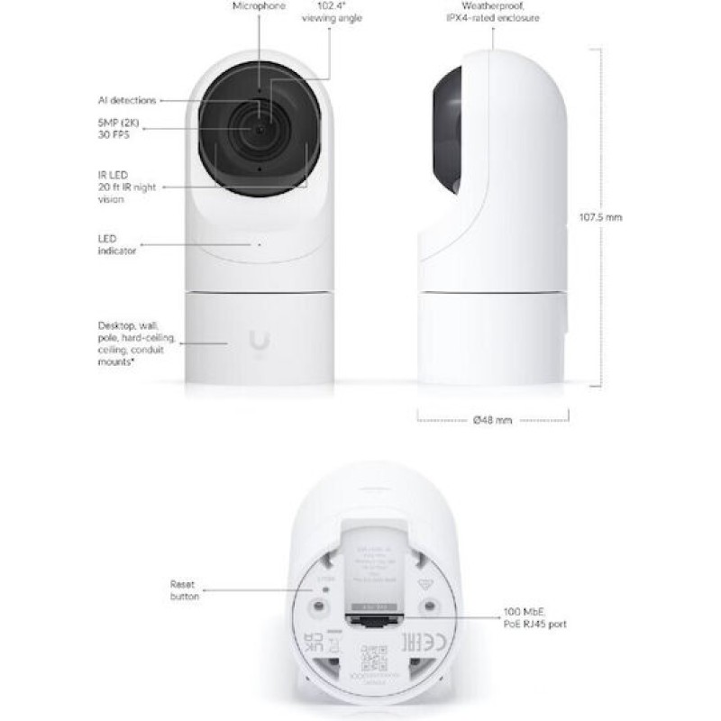 Τα προϊόντα που δεν αναγράφουν διαθέσιμο σημαίνει ότι δεν υπάρχουν άμεσα διαθέσιμα στο κατάστημα και θα παραληφθούν το αργότερο εντός των εργάσιμων ημερών που αναγράφεται στη διαθεσιμότητα. Σε κάθε περίπτωση η ημερομηνία μπορεί να μεταβληθεί και θα υπάρχει σχετική ενημέρωσή σας.Η Ubiquiti UniFi G5 Flex (UVC-G5-Flex) είναι μια συμπαγής κάμερα ασφαλείας 2K HD, ιδανική για εσωτερική και εξωτερική παρακολούθηση σε οικιακούς και εμπορικούς χώρους. Σχεδιασμένη για εύκολη εγκατάσταση και ενσωμάτωση με την πλατφόρμα UniFi Protect, προσφέρει προηγμένες δυνατότητες σε ένα κομψό και ανθεκτικό περίβλημα. Η κάμερα διαθέτει ανάλυση 4MP (2688 x 1512) με αναλογία 16:9 και γωνία θέασης 102.4° οριζόντια, 54.9° κάθετα και 120.6° διαγώνια. Υποστηρίζει ρυθμό καρέ έως 30 FPS. Ο αισθητήρας είναι CMOS 5MP, ενώ ο φακός είναι σταθερού εστιακού μήκους. Για νυχτερινή παρακολούθηση, ενσωματώνει φωτισμό υπερύθρων (IR LED) με απόσταση κάλυψης έως 6 μέτρα. Η συνδεσιμότητα με το δίκτυο επιτυγχάνεται μέσω θύρας RJ45 10/100 Mbps, ενώ η τροφοδοσία παρέχεται μέσω Power over Ethernet (PoE) με τάση 37–57V DC και μέγιστη κατανάλωση 4W. Η κάμερα διαθέτει ενσωματωμένο μικρόφωνο, το οποίο μπορεί να απενεργοποιηθεί μέσω λογισμικού. Η κατασκευή της είναι ανθεκτική με πιστοποίηση IPX4 για προστασία από πιτσιλιές νερού και IK04 για ανθεκτικότητα σε βανδαλισμούς.