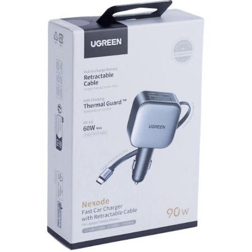 Ugreen Φορτιστής Αυτοκινήτου 90W 3A Γρήγορης Φόρτισης με Θύρες: 1xUSB 1xType-C μαζί με Καλώδιο Ενσωματωμένο Γκρι Χρώμα (EC603/55909B)