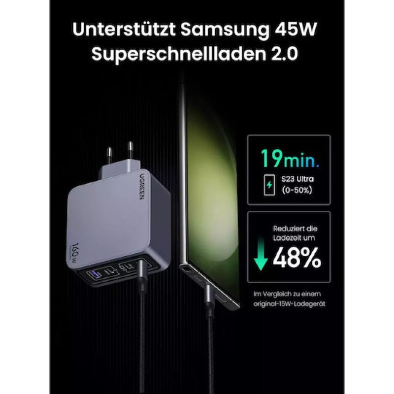 Ugreen Φορτιστής GaN με Θύρα USB-A και 3 Θύρες USB-C και Καλώδιο USB-C - USB-C 160W Power Delivery Μαύρος (Nexode Pro) (25877)