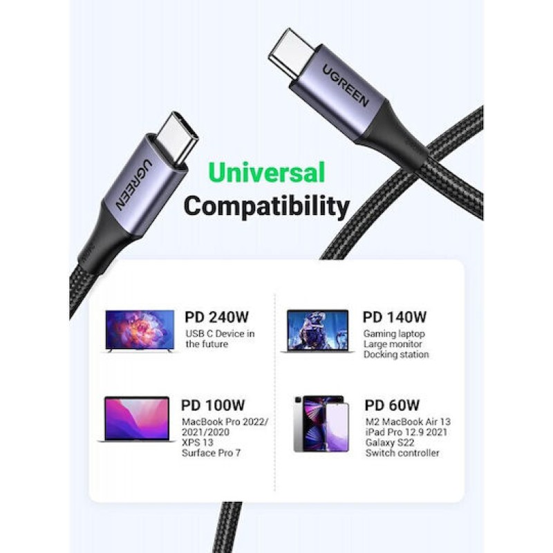 Το καλώδιο αυτό υποστηρίζει την φόρτιση και τη μεταφορά δεδομένων σε φορητές συσκευές, παρέχοντας ισχύ έως 240W. Είναι ιδανικό για υπολογιστές με είσοδο USB Type C Power Delivery, εξασφαλίζοντας γρήγορη και ασφαλή φόρτιση.