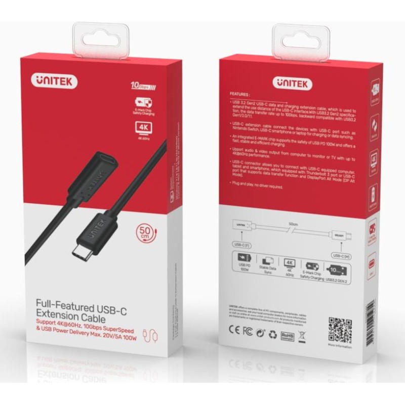 Unitek USB 3.2 Cable USB-C male - USB-C female Μαύρο 0.5m (C14086BK) (C14086BK)