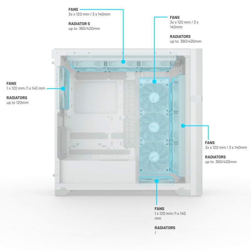 | Υποστηριζόμενες διαμέτρους ανεμιστήρων εμπρός | 120, 140 mm |