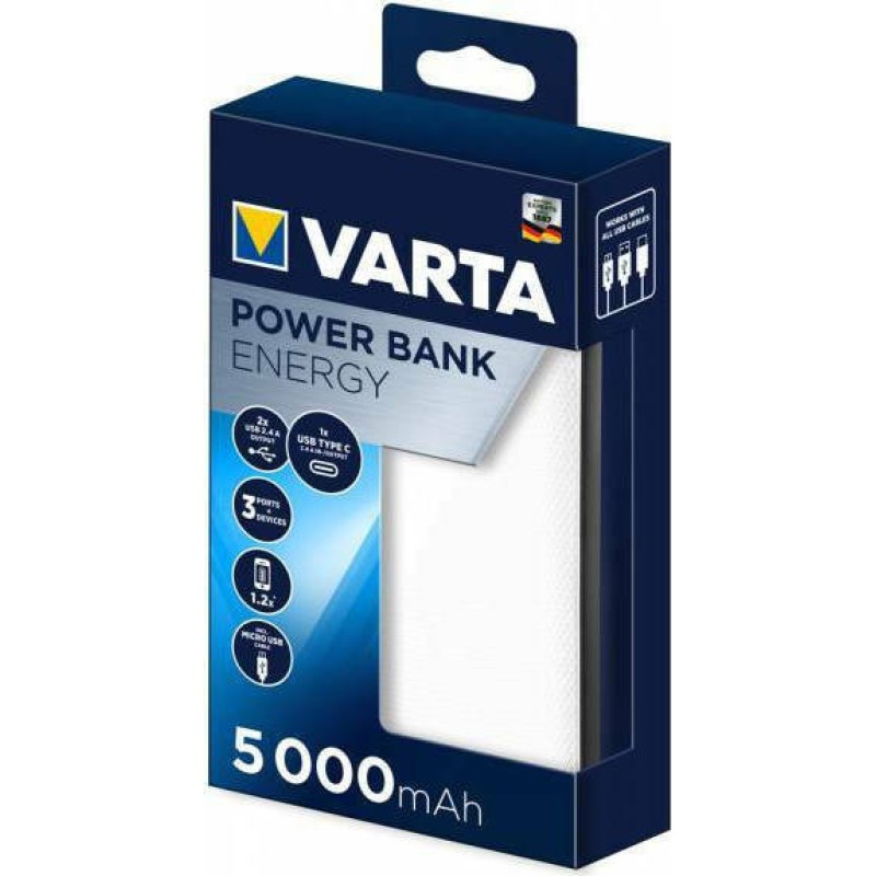 Varta Energy Power Bank 5000mAh με 2 Θύρες USB-A και Θύρα USB-C Λευκό (57975101111)