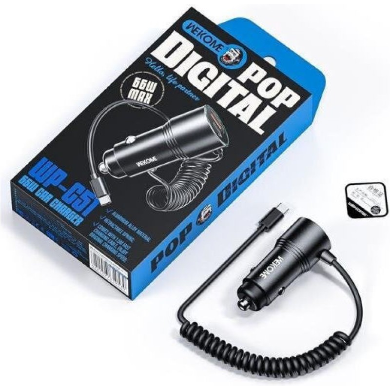 WK Φορτιστής Αυτοκινήτου 66W Γρήγορης Φόρτισης με Θύρες: 1xUSB 1xType-C μαζί με Καλώδιο Type-C Μαύρο Χρώμα (WP-C51)