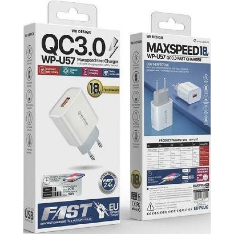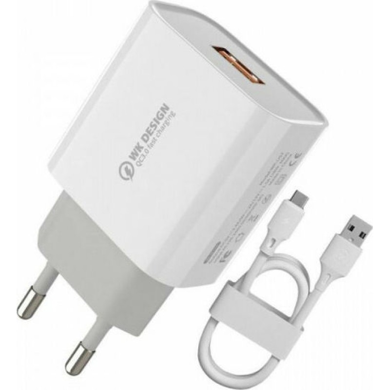 WK Φορτιστής με Θύρα USB-A και Καλώδιο USB-C 18W Quick Charge 3.0 Λευκός (WP-U57) (WP-U57 COMBO)