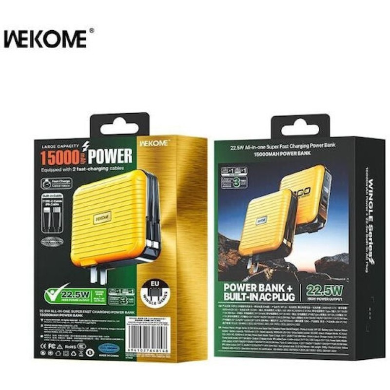 Τα προϊόντα που δεν αναγράφουν διαθέσιμο σημαίνει ότι δεν υπάρχουν άμεσα διαθέσιμα στο κατάστημα και θα παραληφθούν το αργότερο εντός των εργάσιμων ημερών που αναγράφεται στη διαθεσιμότητα. Σε κάθε περίπτωση η ημερομηνία μπορεί να μεταβληθεί και θα υπάρχει σχετική ενημέρωσή σας.Το power bank της WK διαθέτει χωρητικότητα 15000mAh, ικανή να παρέχει 2-3 φορτίσεις στη συσκευή σας χωρίς την ανάγκη συχνών επαναφορτίσεων. Περιλαμβάνει ένα βύσμα εναλλασσόμενου ρεύματος και δύο ενσωματωμένα καλώδια σύνδεσης, ένα Lightning και ένα USB-C, με μέγιστη ισχύ 22,5W. Διαθέτει επίσης μία θύρα USB και μία θύρα USB-C σύμφωνα με το πρότυπο Quick Charge 3.0, προσφέροντας γρήγορη και αποτελεσματική φόρτιση για συσκευές που υποστηρίζουν την ίδια τεχνολογία.