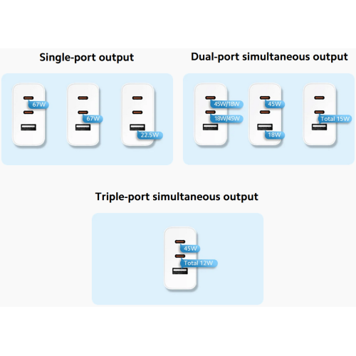 Η τρίτη γενιά τεχνολογίας GaN διαθέτει βελτιωμένη θερμική αγωγιμότητα με υψηλότερη αντοχή στη θερμοκρασία και την τάση, καθιστώντας τον φορτιστή μικρό και ελαφρύ, ενώ παράλληλα βελτιώνει την έξοδο και τη μετατροπή σε σύγκριση με τους τυπικούς φορτιστές ισχύος. Η μονή θύρα Type-C παρέχει μέγιστη ισχύ εξόδου 67W και η θύρα USB-A 22.5W. Οι τρεις θύρες παρέχουν γρήγορη φόρτιση για πολλές συσκευές ταυτόχρονα. Η έξυπνη αναγνώριση δίνει προτεραιότητα στους υπολογιστές για φόρτιση και τους παρέχει σταθερή τροφοδοσία όταν χρησιμοποιούνται πολλές συσκευές.