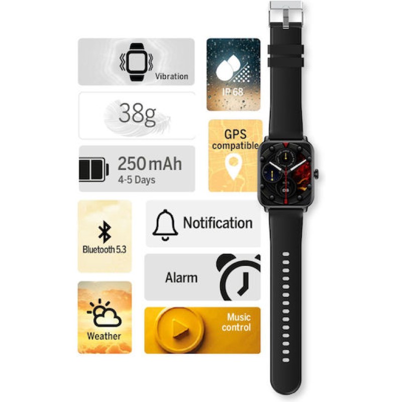Τα προϊόντα που δεν αναγράφουν διαθέσιμο σημαίνει ότι δεν υπάρχουν άμεσα διαθέσιμα στο κατάστημα και θα παραληφθούν το αργότερο εντός των εργάσιμων ημερών που αναγράφεται στη διαθεσιμότητα. Σε κάθε περίπτωση η ημερομηνία μπορεί να μεταβληθεί και θα υπάρχει σχετική ενημέρωσή σας.Το smartwatch διαθέτει μοντέρνο σχεδιασμό με μέγεθος οθόνης 1,83 ίντσες, ιδανικό για καθημερινή χρήση. Είναι συμβατό με Android και iOS, προσφέροντας ευελιξία στη σύνδεση με διάφορα smartphones. Η μπαταρία των 250 mAh εξασφαλίζει αυτονομία έως 4 ημέρες, ενώ η σύνδεση Bluetooth επιτρέπει εύκολη διασύνδεση με κινητές συσκευές. Το λουράκι είναι κατασκευασμένο από σιλικόνη, προσφέροντας άνεση και ανθεκτικότητα. Επιπλέον, υποστηρίζει ειδοποιήσεις μέσω email, SMS, αναγνώριση κλήσεων και ειδοποιήσεις εφαρμογών, καθιστώντας το ένα πλήρες εργαλείο για την παρακολούθηση της καθημερινότητας και της υγείας.