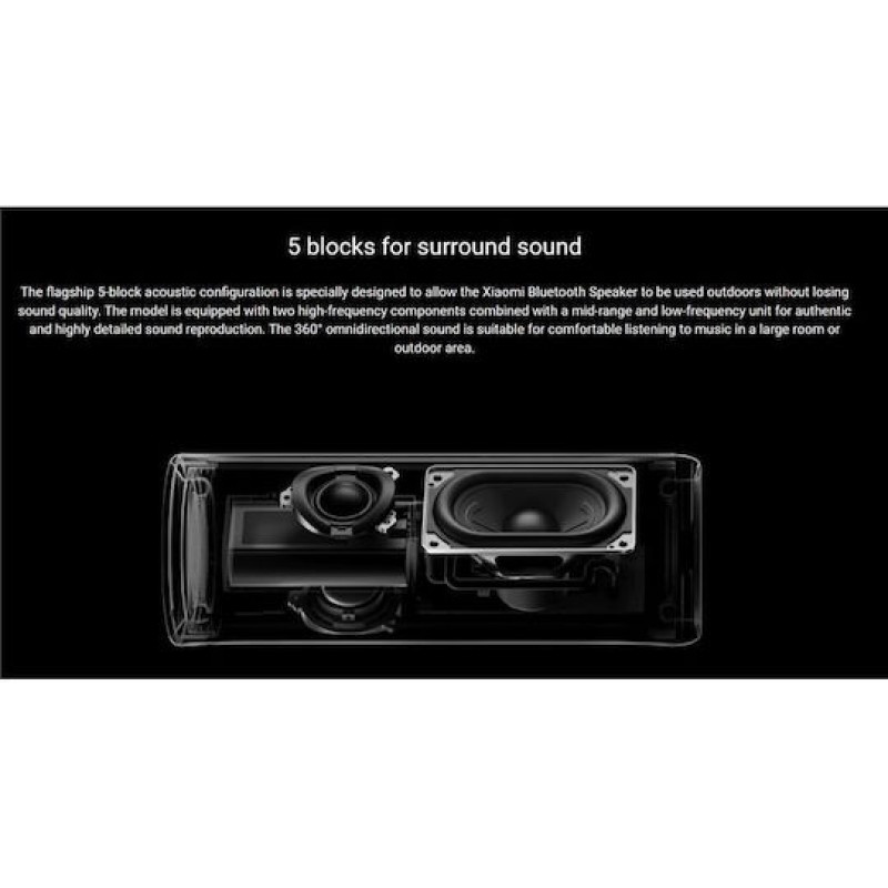 Τα προϊόντα που δεν αναγράφουν διαθέσιμο σημαίνει ότι δεν υπάρχουν άμεσα διαθέσιμα στο κατάστημα και θα παραληφθούν το αργότερο εντός των εργάσιμων ημερών που αναγράφεται στη διαθεσιμότητα. Σε κάθε περίπτωση η ημερομηνία μπορεί να μεταβληθεί και θα υπάρχει σχετική ενημέρωσή σας.Το φορητό bluetooth ηχείο της Xiaomi με ισχύ 40 watt, περιέχει εσωτερικά δύο full-range ηχεία για στερεοφωνικό ήχο και ένα subwoofer για πιο γεμάτο μπάσο. Mε μια πλήρη φόρτιση, σας προσφέρει έως 5 ώρες συνεχούς αναπαραγωγής μουσικής. Επιπλέον έχει την δυνατότητα φόρτισης μέσω usb, για να μπορείτε εύκολα να το φορτίσετε με powerbank. Με βαθμό προστασίας IP67, μπορείτε να πάρετε το ηχείο μαζί σας στη παραλία, την πισίνα ή το δάσος, καθώς έχει πλήρη προστασία από την σκόνη και αντέχει στο νερό για 30', σε βάθος πάνω από 1 μέτρο. Προσοχή η κίνηση μέσα στο νερό δημιουργεί αυξημένη πίεση σαν να το έχουμε σε μεγαλύτερο βάθος.