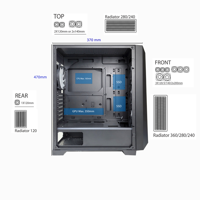 | Υποστήριξη ψύξης με ραδιενεργούς | Εμπρός: 240/280/360 mm, Πάνω: 240/280 mm, Πίσω: 120 mm |